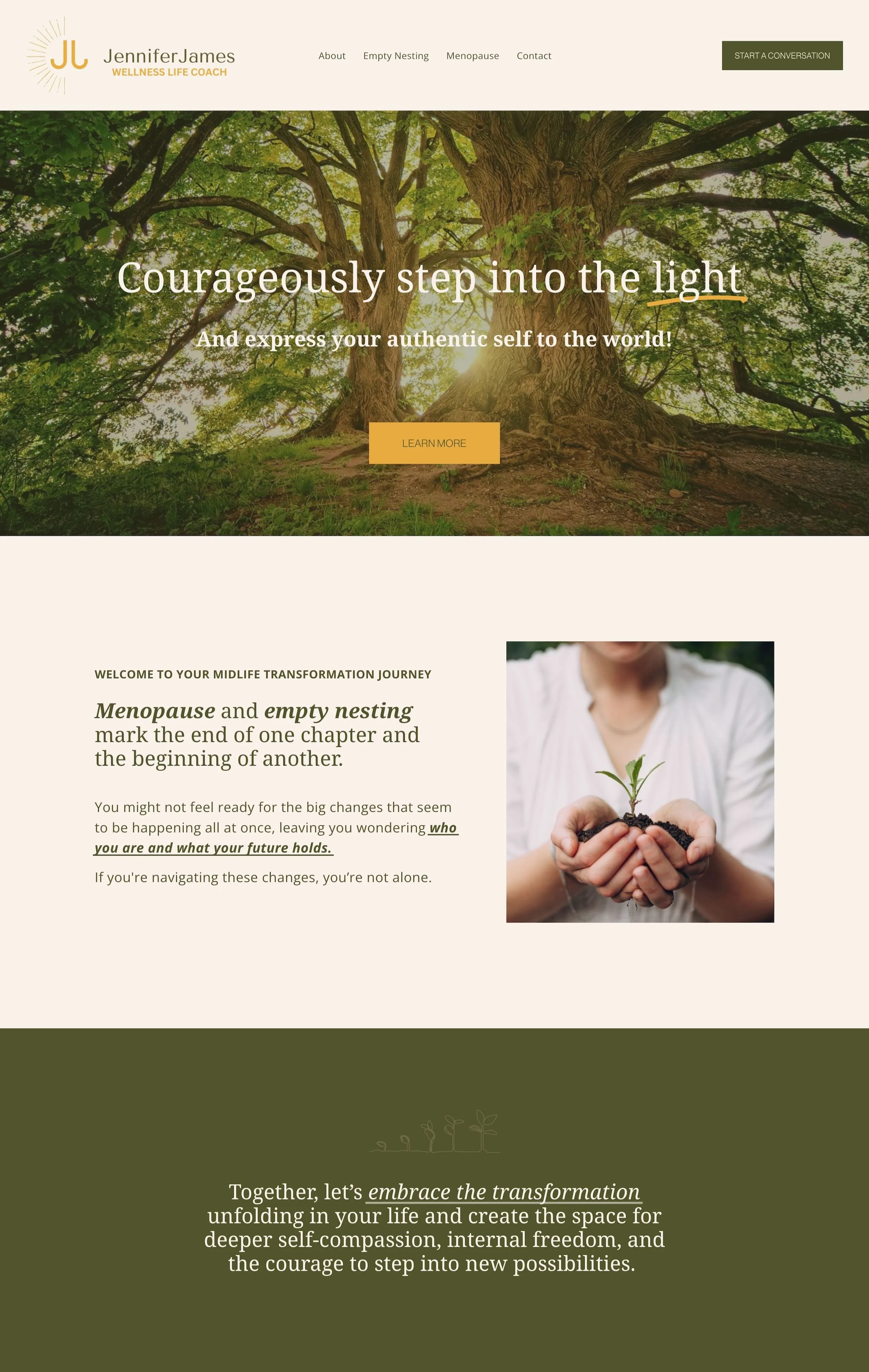 For Jennifer’s branding and website, we chose colors and images that evoked her love of nature, using forest images to represent growth and the sun to represent light, in particular the inner light Jennifer’s work brings out in her clients.